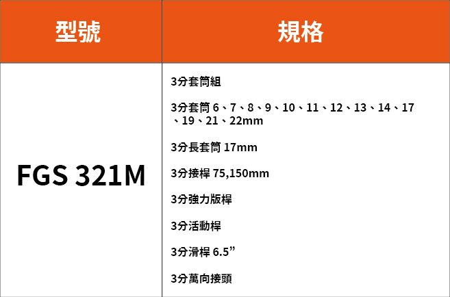 套筒組FGS | 321M 3/8"套筒 21件組